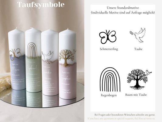 Personalisierte Kerze zur Taufe in Pastellfarben mit Taufsymbol | Name, Datum und Taufspruch