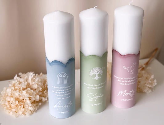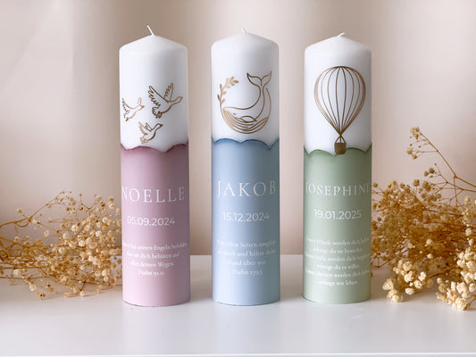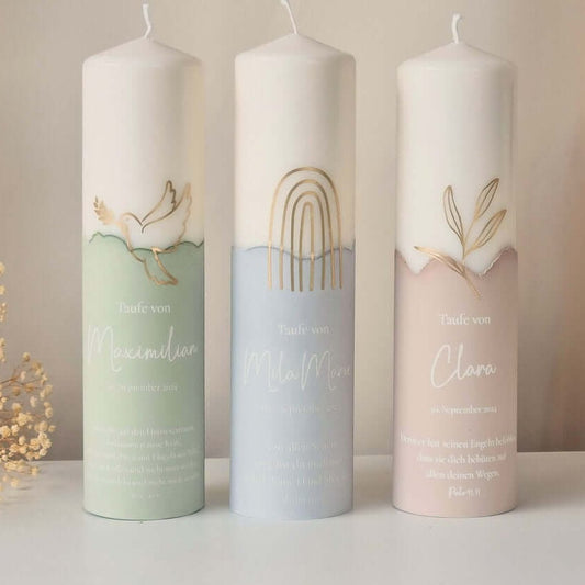 Personalisierte Kerze zur Taufe in Pastellfarben mit Taufsymbol | Name, Datum und Taufspruch