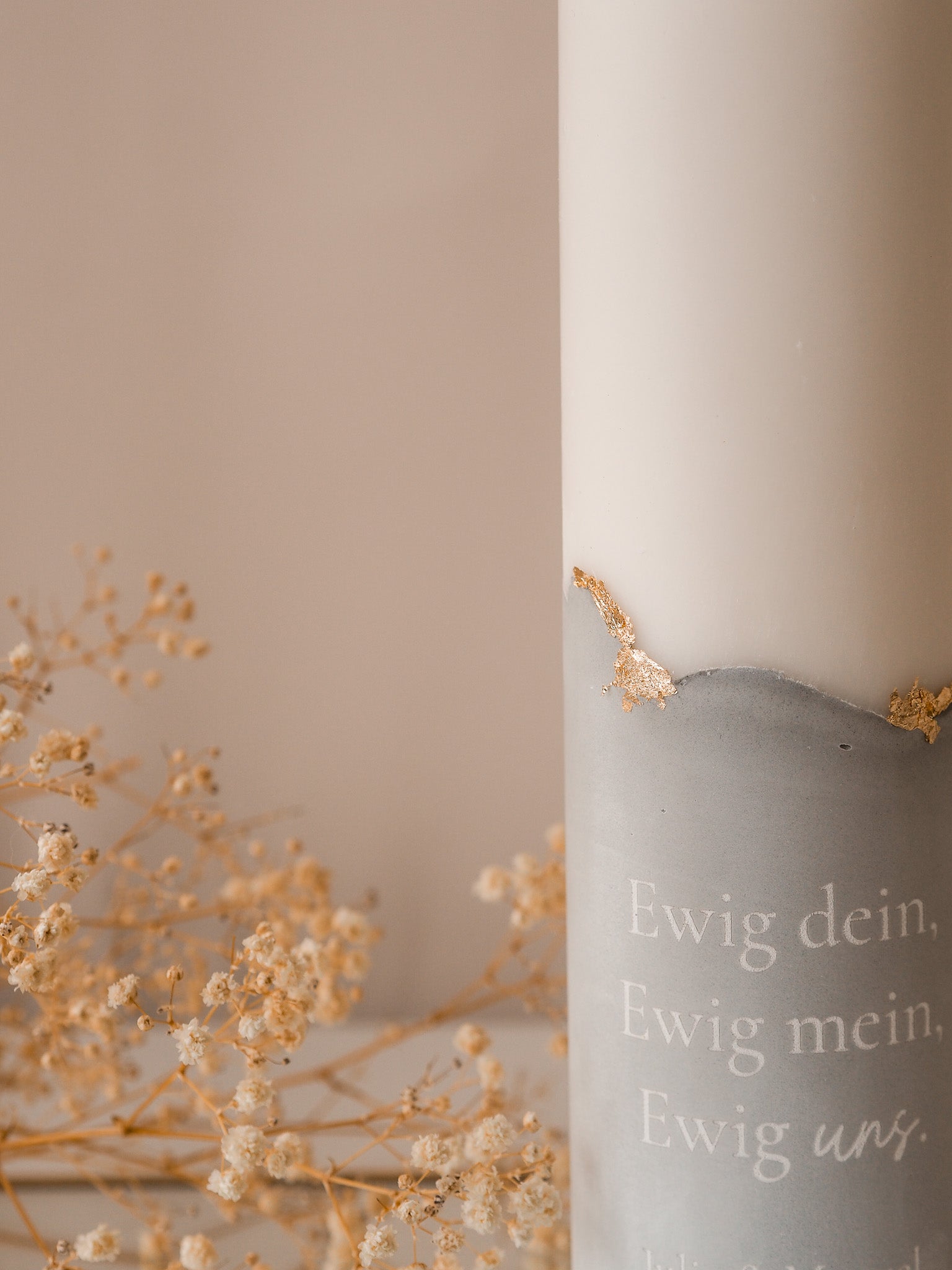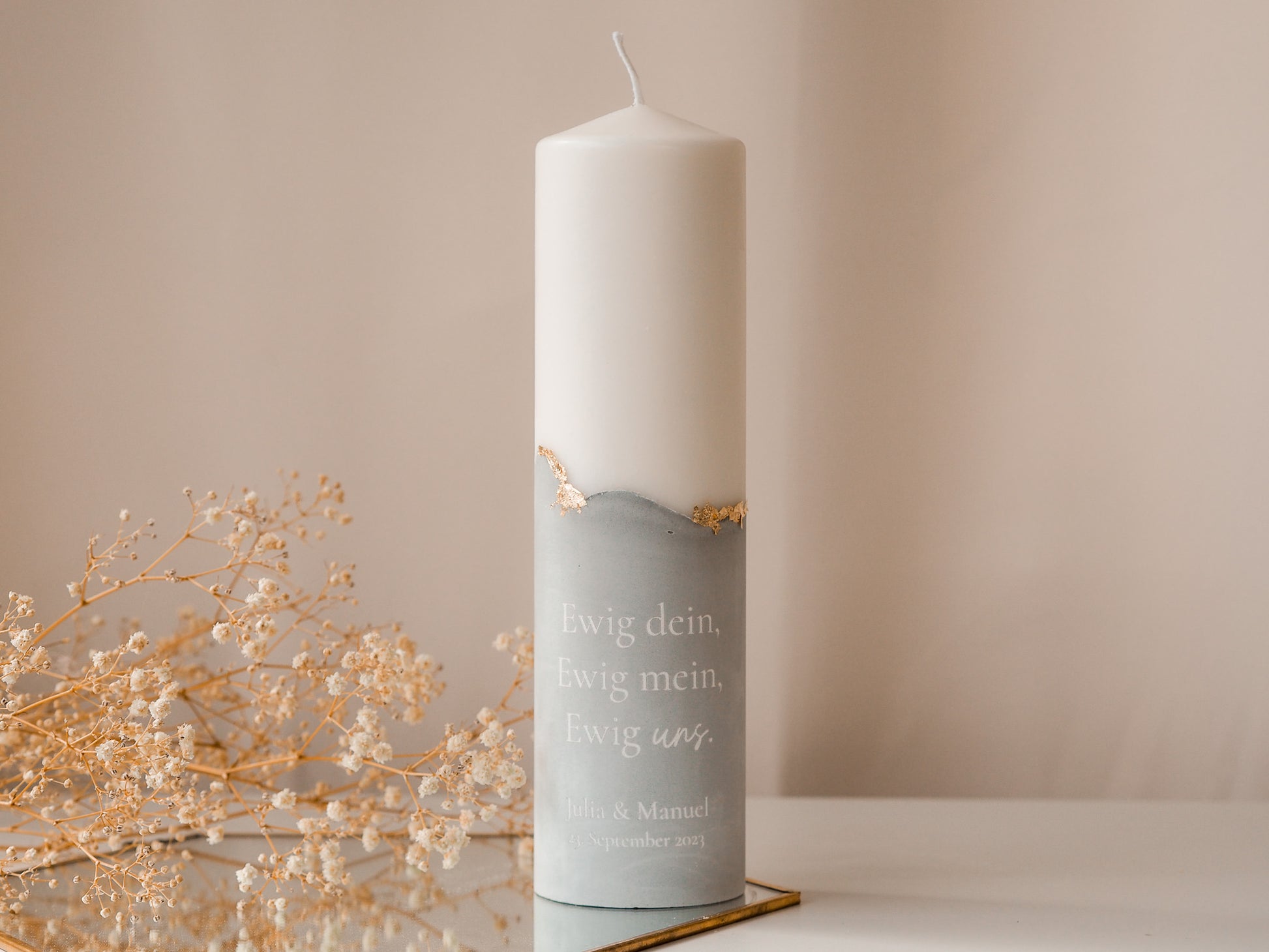 Personalisierte Traukerze mit grauem Gips-Sockel und Blattgold-Akzenten | Trauspruch | Namen und Datum
