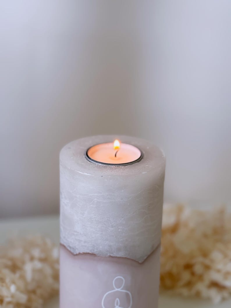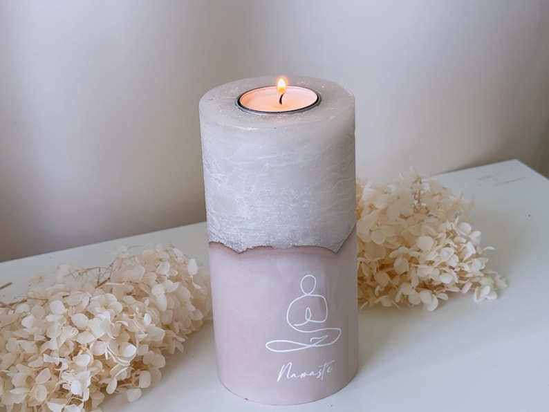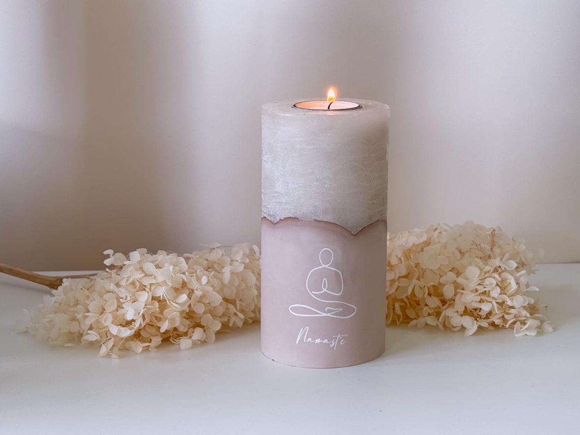 Yoga Kerze "Namaste" mit farbigem Sockel und Teelichteinsatz