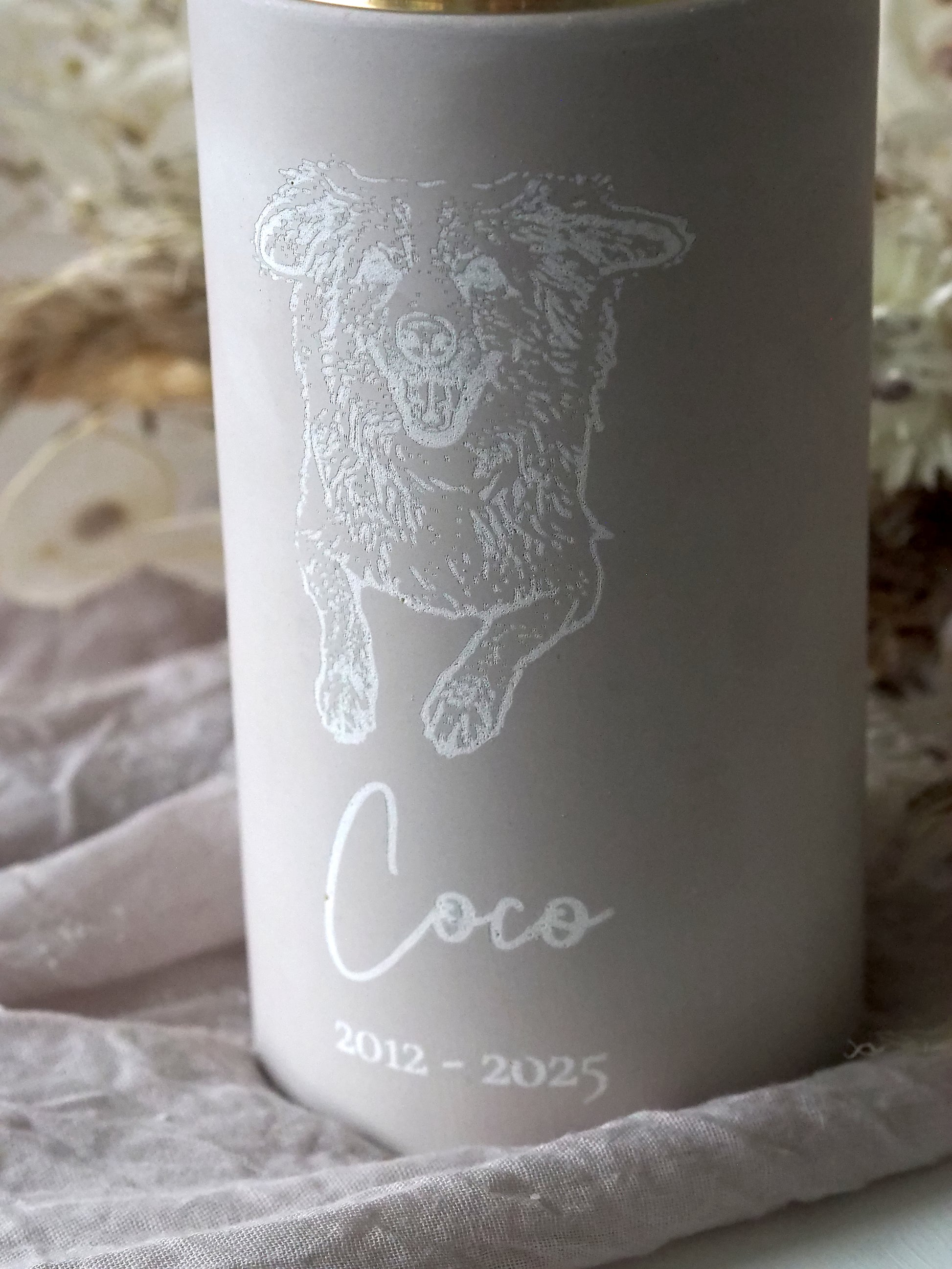Diese stilvolle Tierurne vereint zeitloses Design mit persönlicher Erinnerung: Als Windlicht gestaltet, schafft sie einen würdevollen Platz für deinen verstorbenen Hund oder deine Katze – dezent, edel und mit Liebe handgefertigt.
