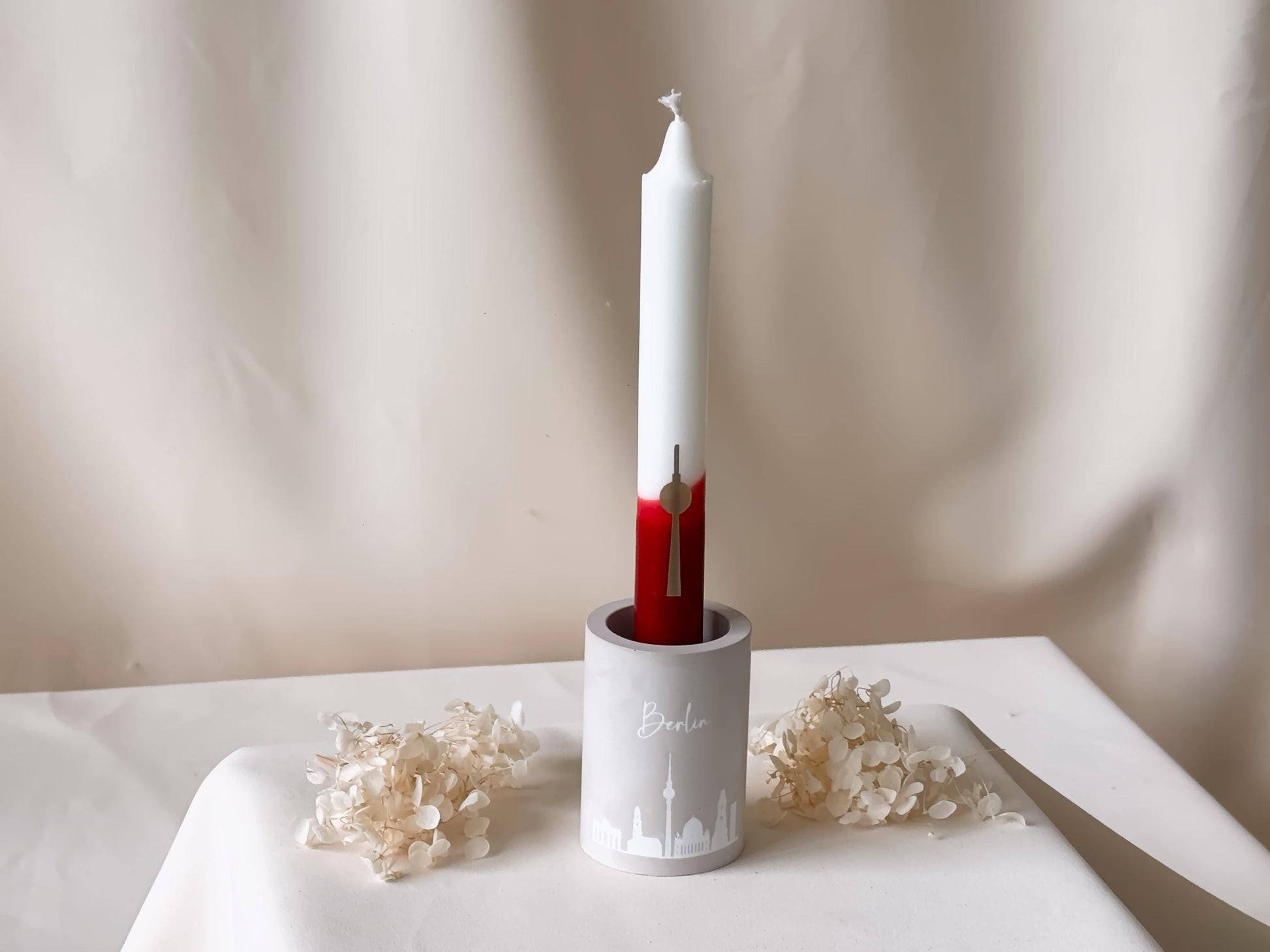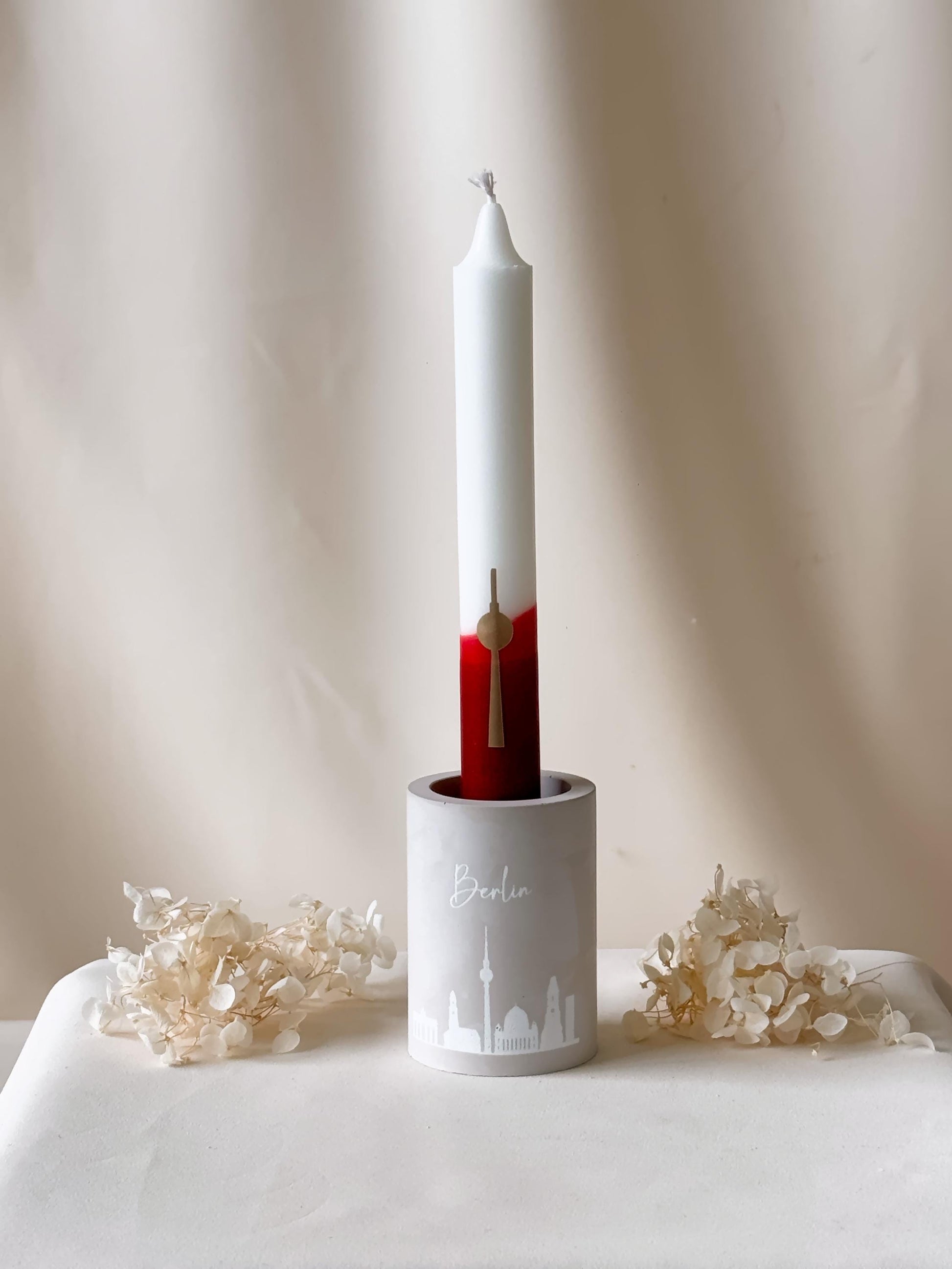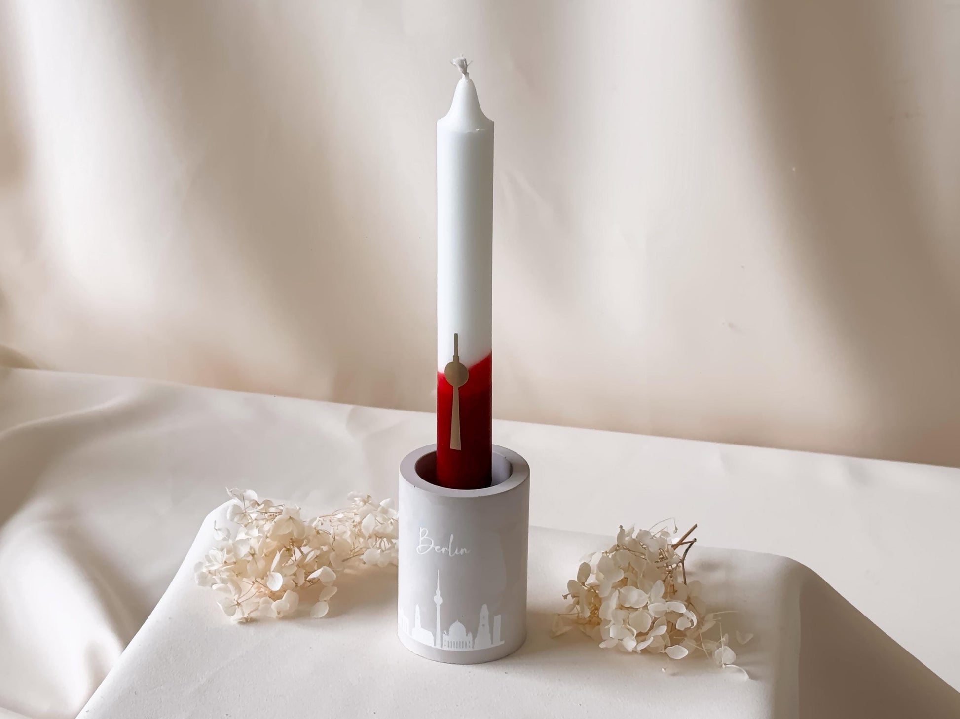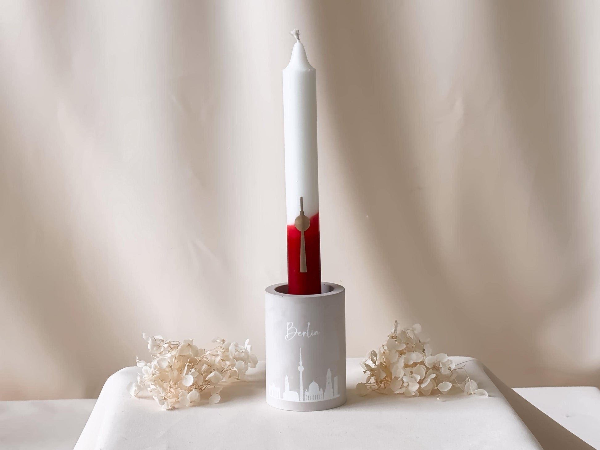 Surprise your loved ones with our stylish "Berlin" candle set. The candle holder is cast from fine plaster and engraved with the Berlin city skyline. It's suitable for both taper candles and tealights. You'll also receive a dip-dye candle featuring a golden TV tower. Your candle set comes gift-wrapped, making it easy to give as a gift.