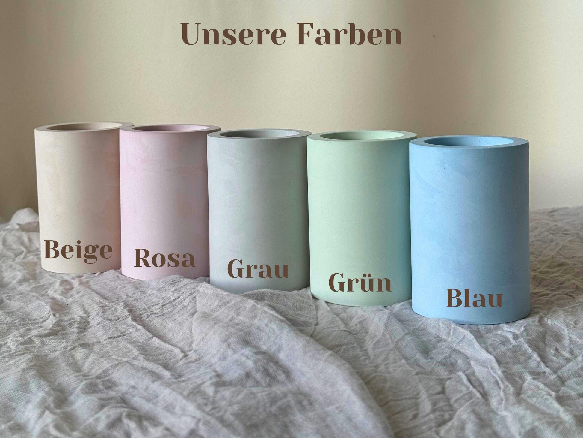 - Engraved candle holder (5 x 8 cm) available in grey, beige, pink, green and blue