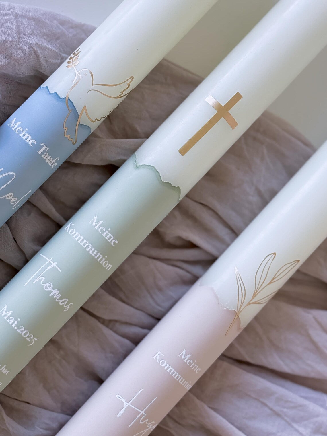 Our communion candles are handmade and carefully personalized to create a unique keepsake of your loved ones' communion.