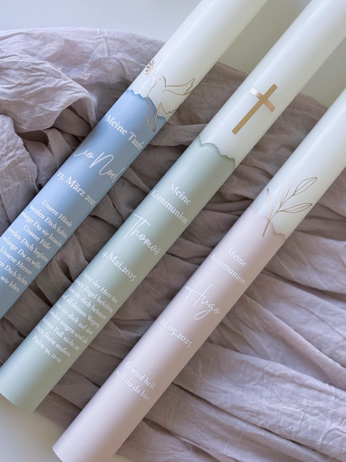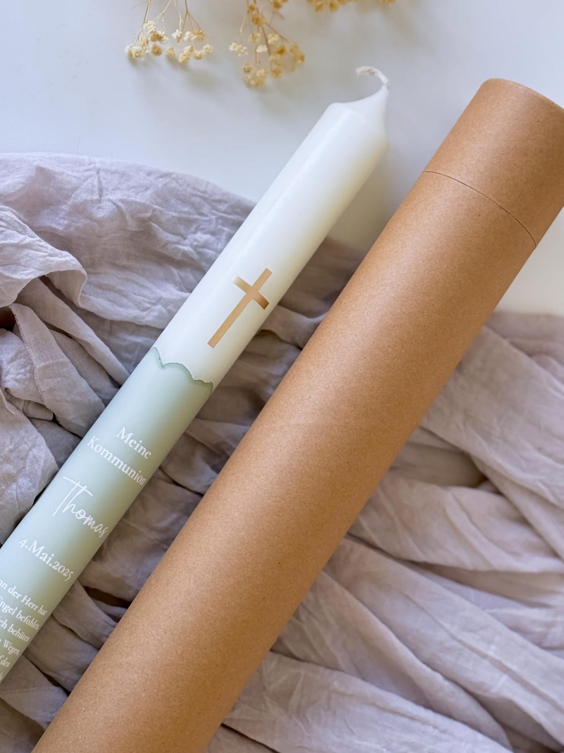 Celebrate your loved one's communion or baptism with a very special, personalized candle. Our white communion and baptism candles with a plaster base in various colors are personalized with an elegant white engraving.