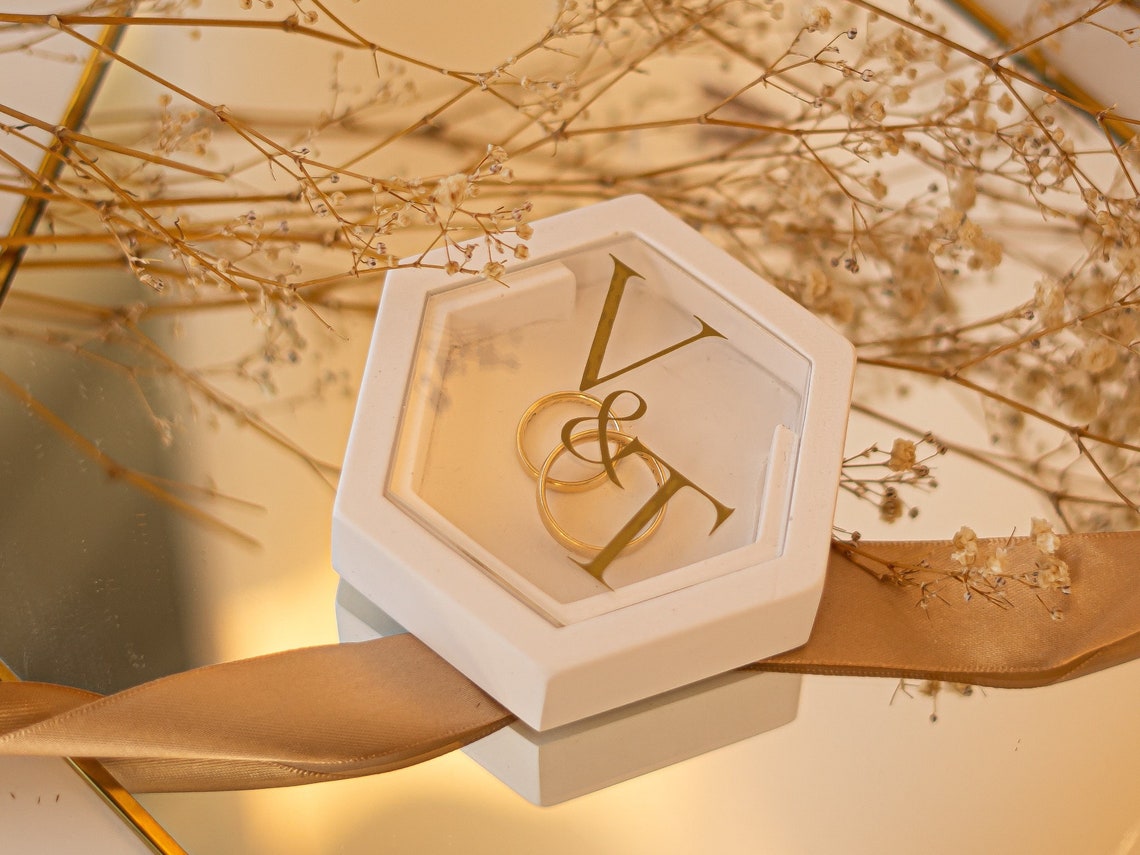 Modern hexagonal ring box with personalized acrylic disc | A special accessory for your wedding