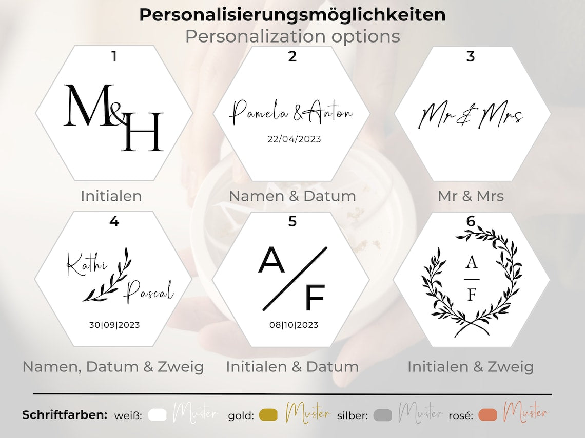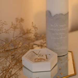Our personalized hexagonal plaster ring box is a unique accessory that will make your wedding unforgettable! This box is ideal for storing your wedding rings during the ceremony and perfectly displaying them. Personalize the acrylic disc according to your preferences and choose the color combination that perfectly suits you and your wedding!