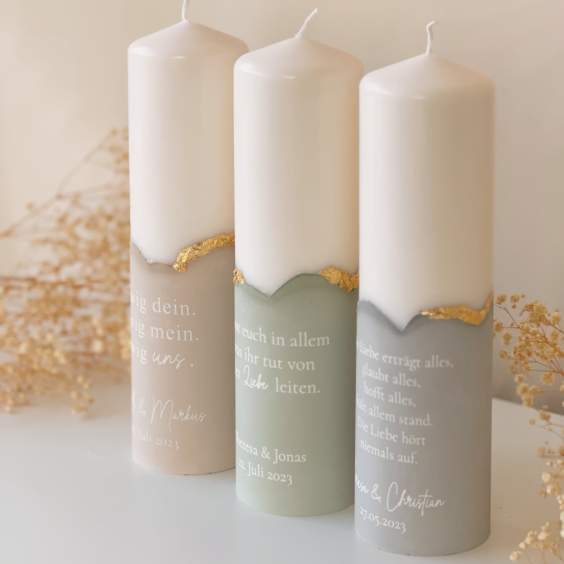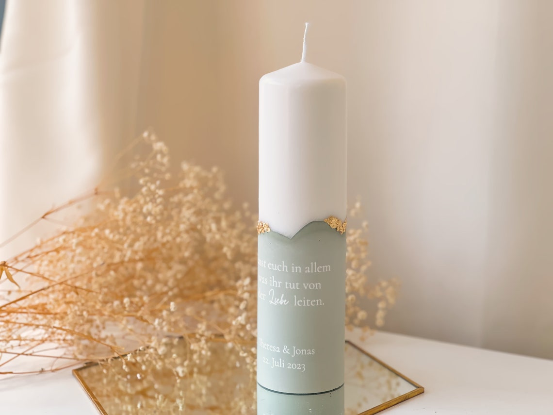 Personalized wedding candle with olive-green plaster base and gold leaf accents | Wedding motto | Names and date